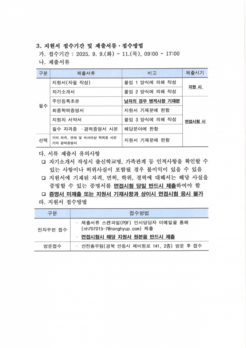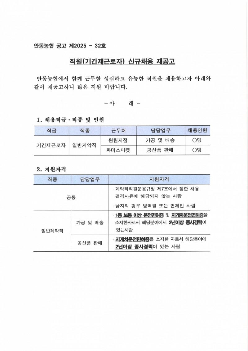 안동농협 직원(기간제근로자) 신규채용 재공고