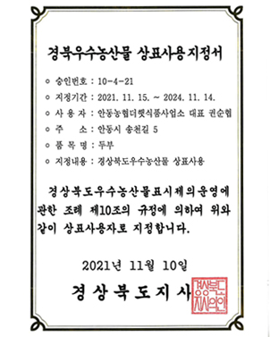 - 전통식품인증, 경북우수농산물지정, 안동시특산품지정으로 전통먹거리문화 계승합니다.