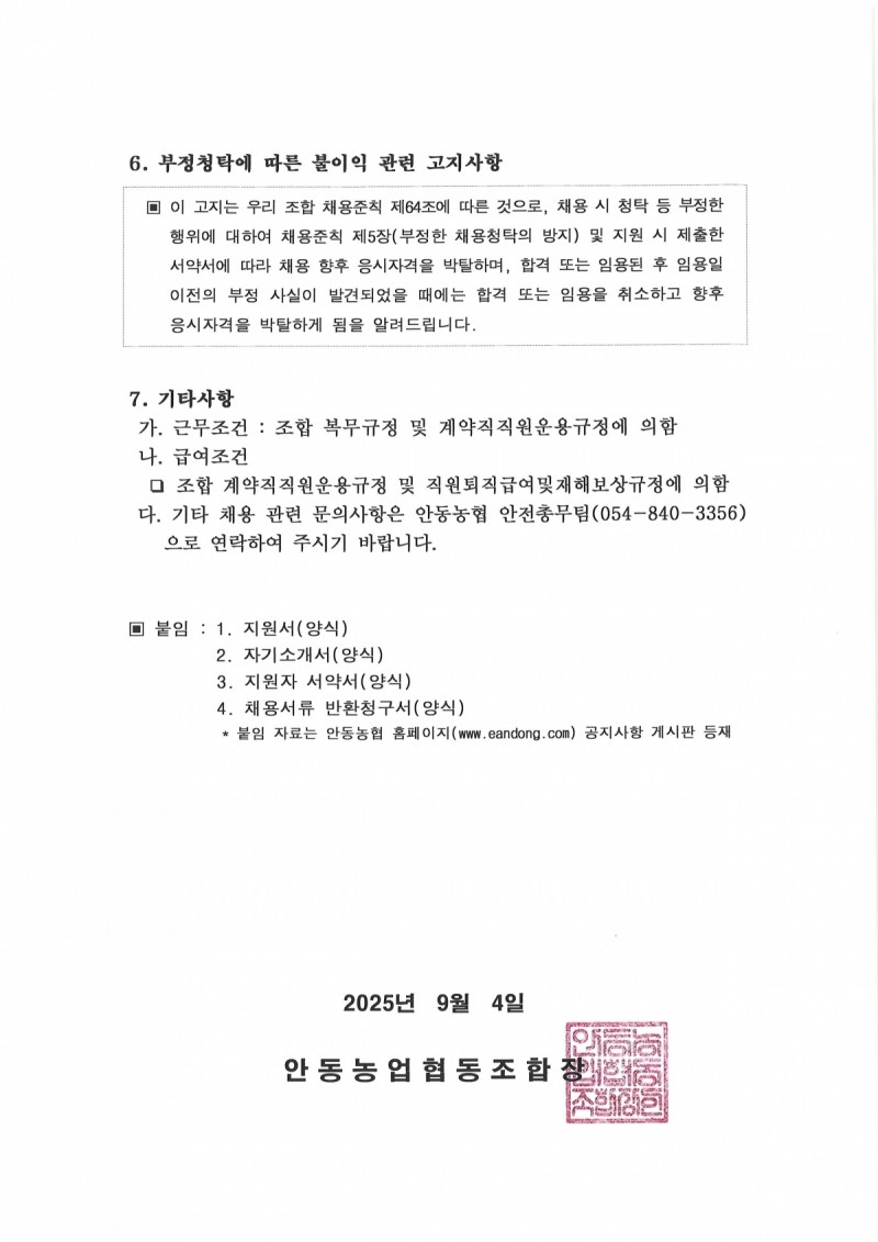 안동농협 직원(기간제근로자) 신규채용 재공고