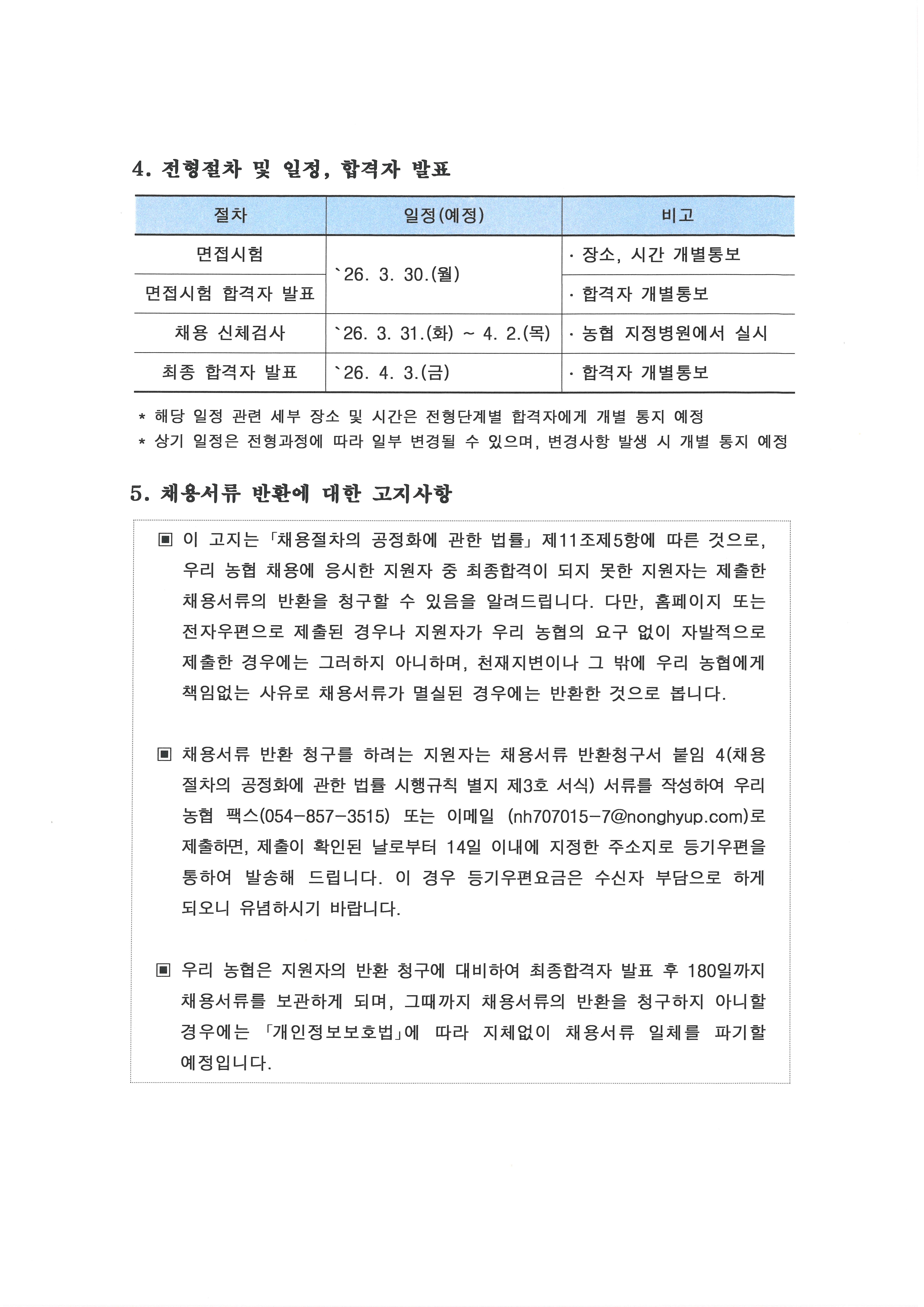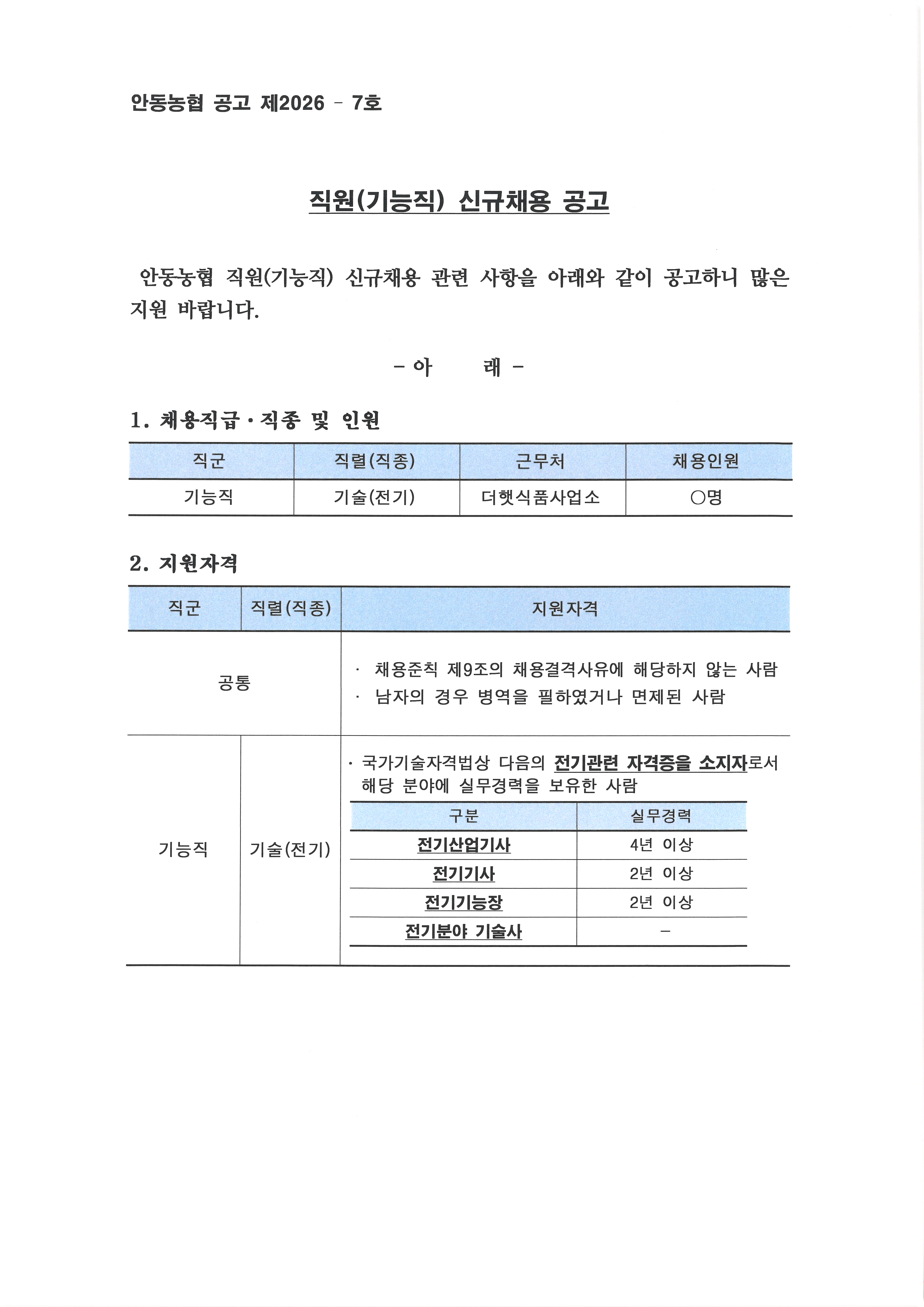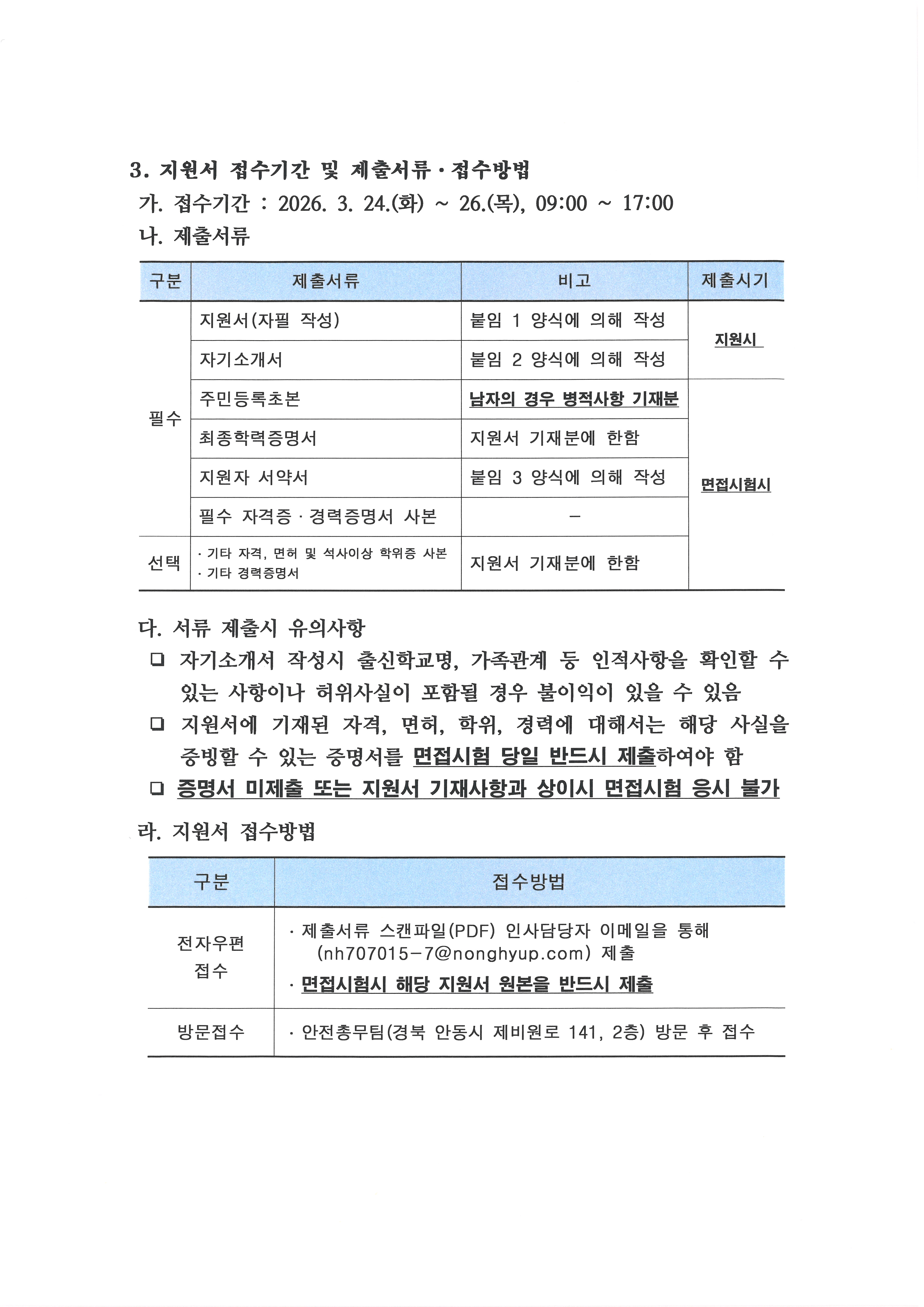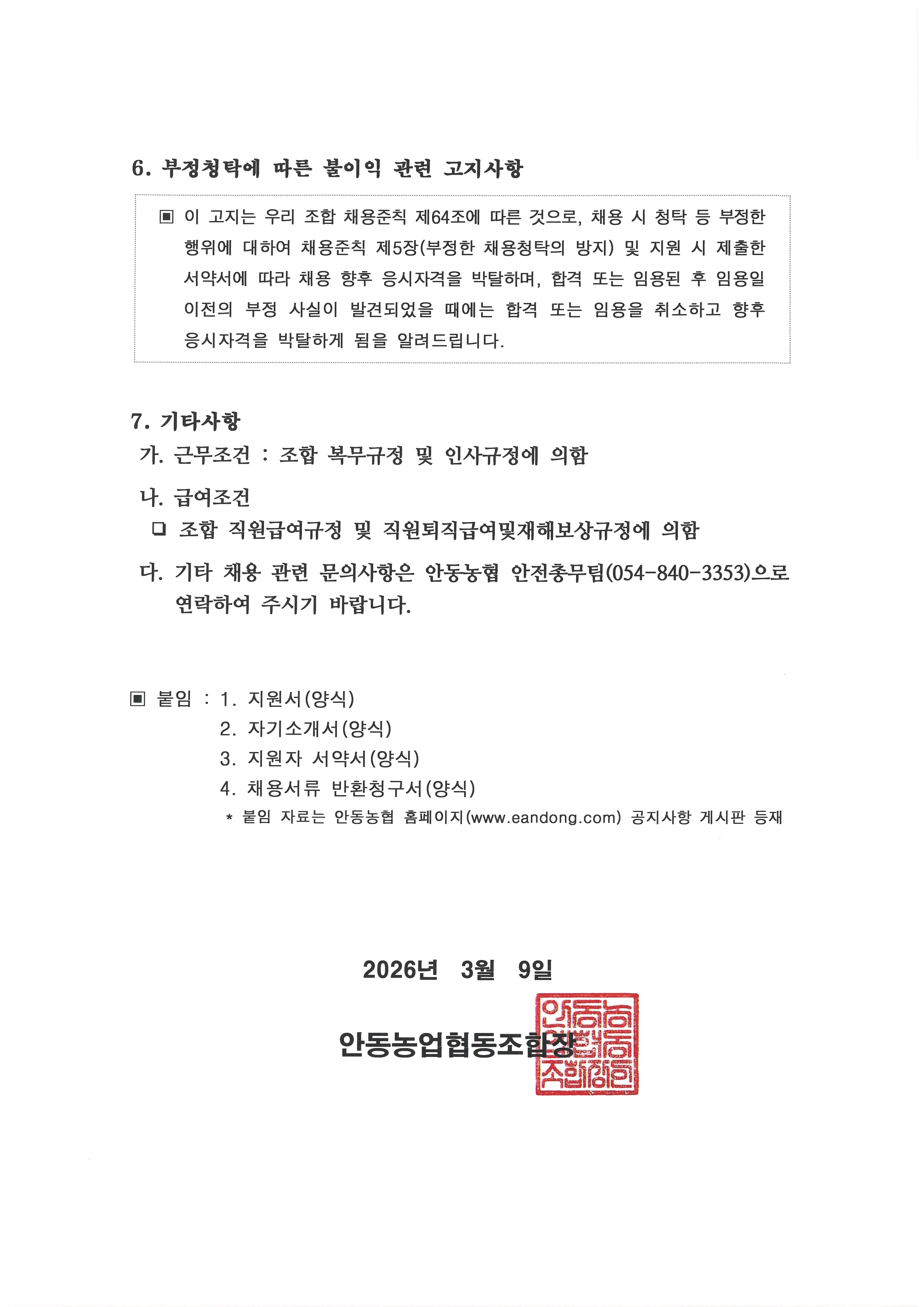 fnctId=bbs,fnctNo=796 안동농협 직원(기능직) 신규채용 공고 수정일 2026.03.23 작성자 총무팀 조회수 599 등록일 2026.03.09 첨부파일 1. 지원서(양식).hwp 2. 자기소개서(양식).hwp 3. 지원자 서약서(양식).hwp 4. 채용서류 반환청구서(양식).hwp
