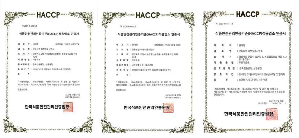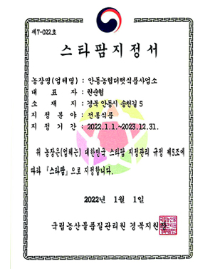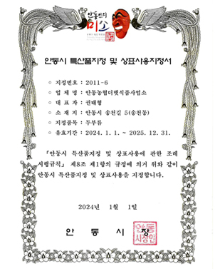 - 전통식품인증, 경북우수농산물지정, 안동시특산품지정으로 전통먹거리문화 계승합니다.